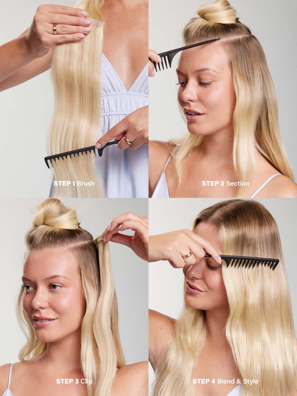 - Aplicação: Aplicação em minutos, faça você mesma. Prepare seu cabelo, lave, desembarace e penteie bem. Aplique as tela em todo comprimento e nas laterais, onde deseja dar maior volume e comprimento. Finalize: misture com seu cabelo e estilize como quiser.